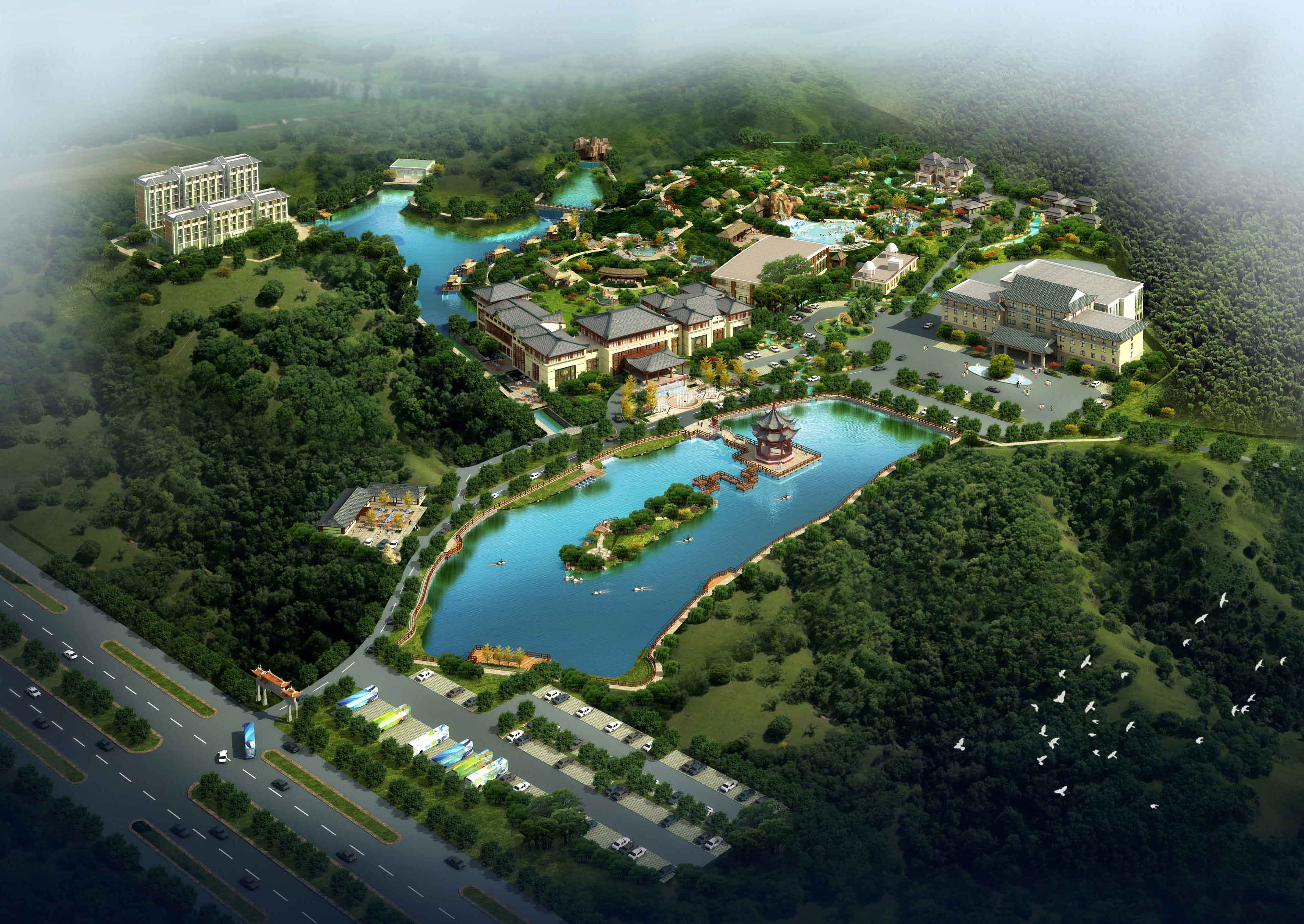温泉中心项目整合了地区珍稀富含氟的偏硅酸温泉、森林、山谷、人文景点等资源,构筑一个生态、优美的森林山水温泉。共配套有中式、日式、欧式温泉泡池52个,“城中村、村中林、林中泉”是温泉的一大特色,汤池与天然环境融为一体,是中国哲学思想“天人合一”的产物。